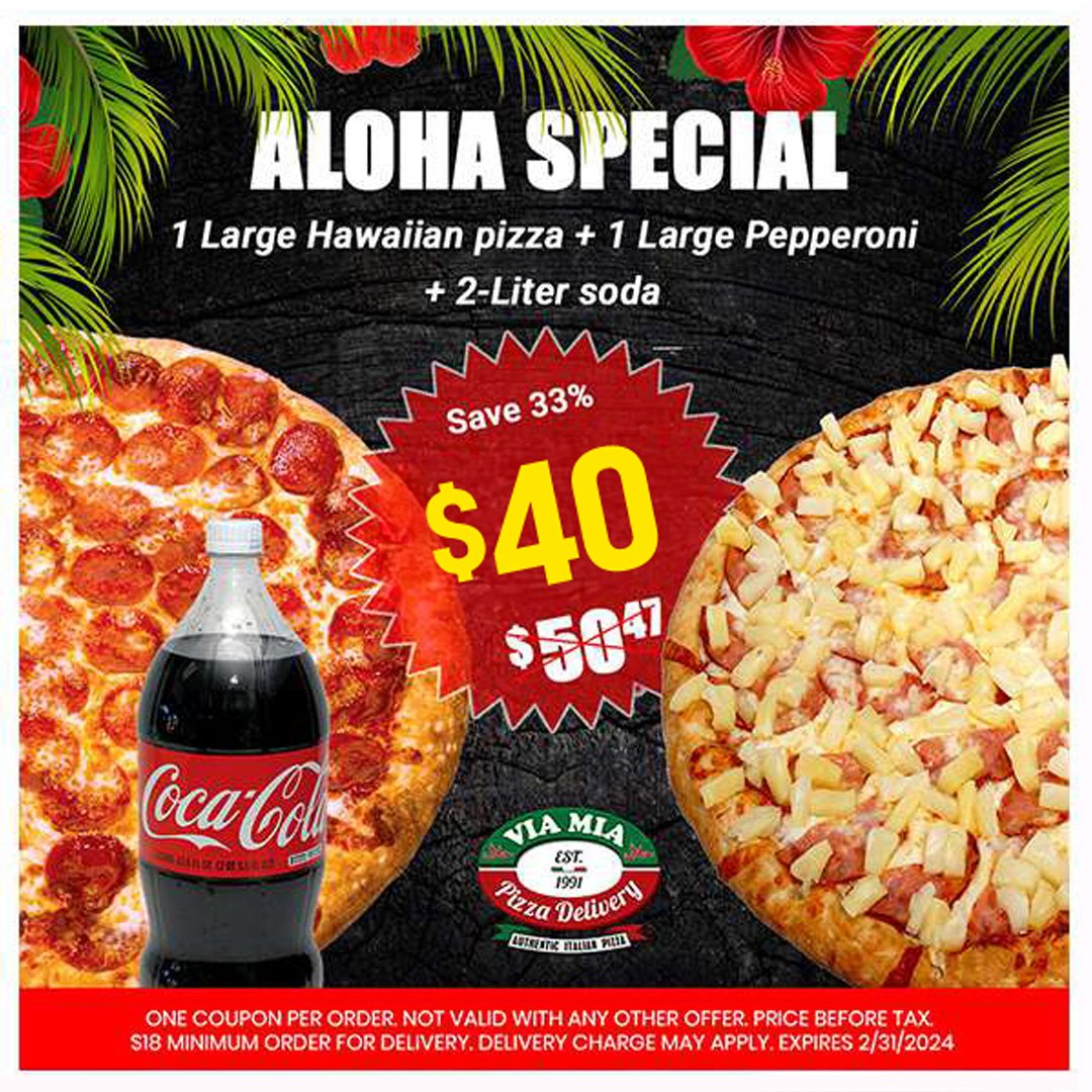 1 Large Hawaiian Pizza + 1 Larger Pepperoni + 2-Liter Soda
