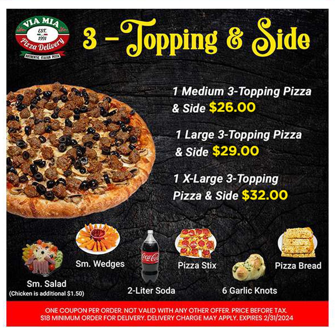 1 X-Larger 3-Topping Pizza & Side $32.00