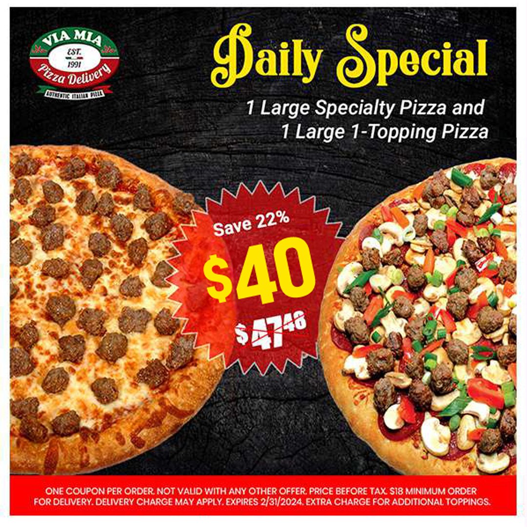 1 Large Specialty Pizza and 1 Large 1-Topping Pizza