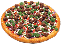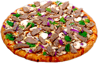 Tomato sauce, chopped garlic, Roma tomatoes, red & green onions, ground beef marinated with lemon & herbs, topped with feta cheese (no mozzarella)
