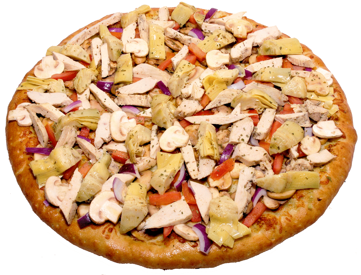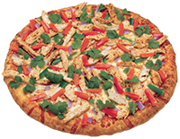 Creamy garlic sauce, mozzarella cheese, grilled chicken, spinach, Roma tomatoes, crispy bacon, red onions