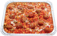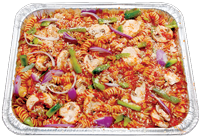 Oven baked Rotini pasta topped with marinara sauce, fresh mushrooms, red onions and green bell peppers.