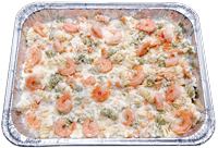 Oven baked Rotini pasta topped with creamy Alfredo sauce and shrimp.