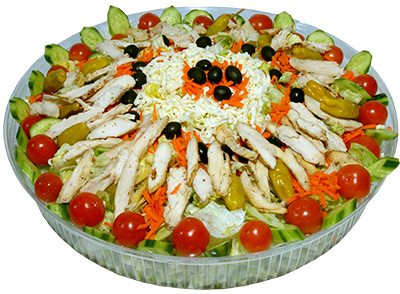 Lettuce, tomatoes, cheese, grilled chicken breast, artichoke hearts, olives, cucumber, pepperoncini, carrots.