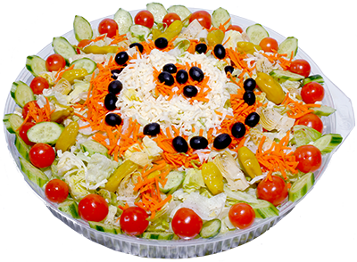 Lettuce, tomatoes, cheese, red onions, artichoke hearts, olives, cucumber, pepperoncini, carrots, feta cheese.