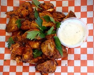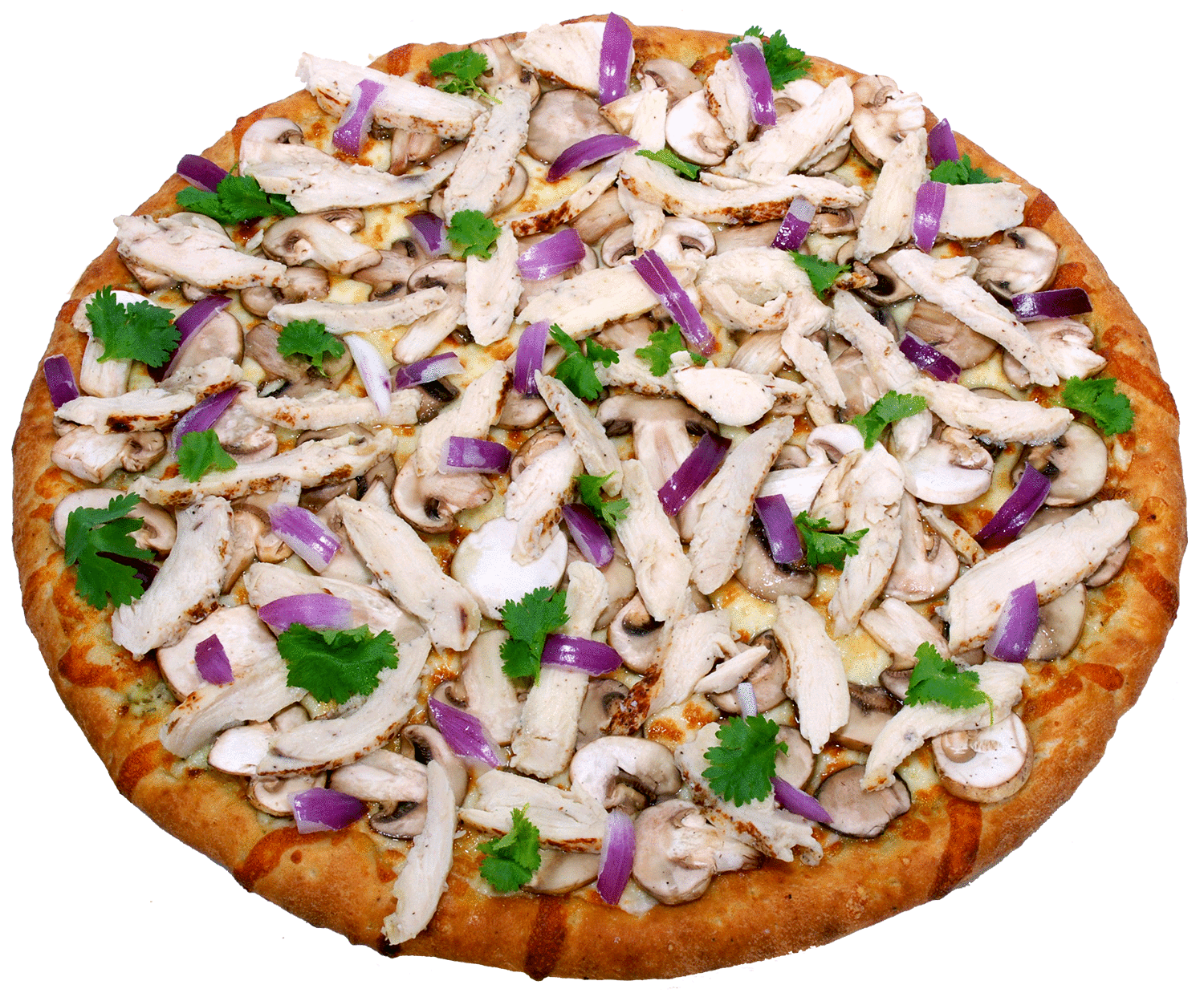 Creamy garlic sauce, mozzarella cheese, grilled chicken, fresh mushrooms, red onions, cilantro and dusted with lemon pepper