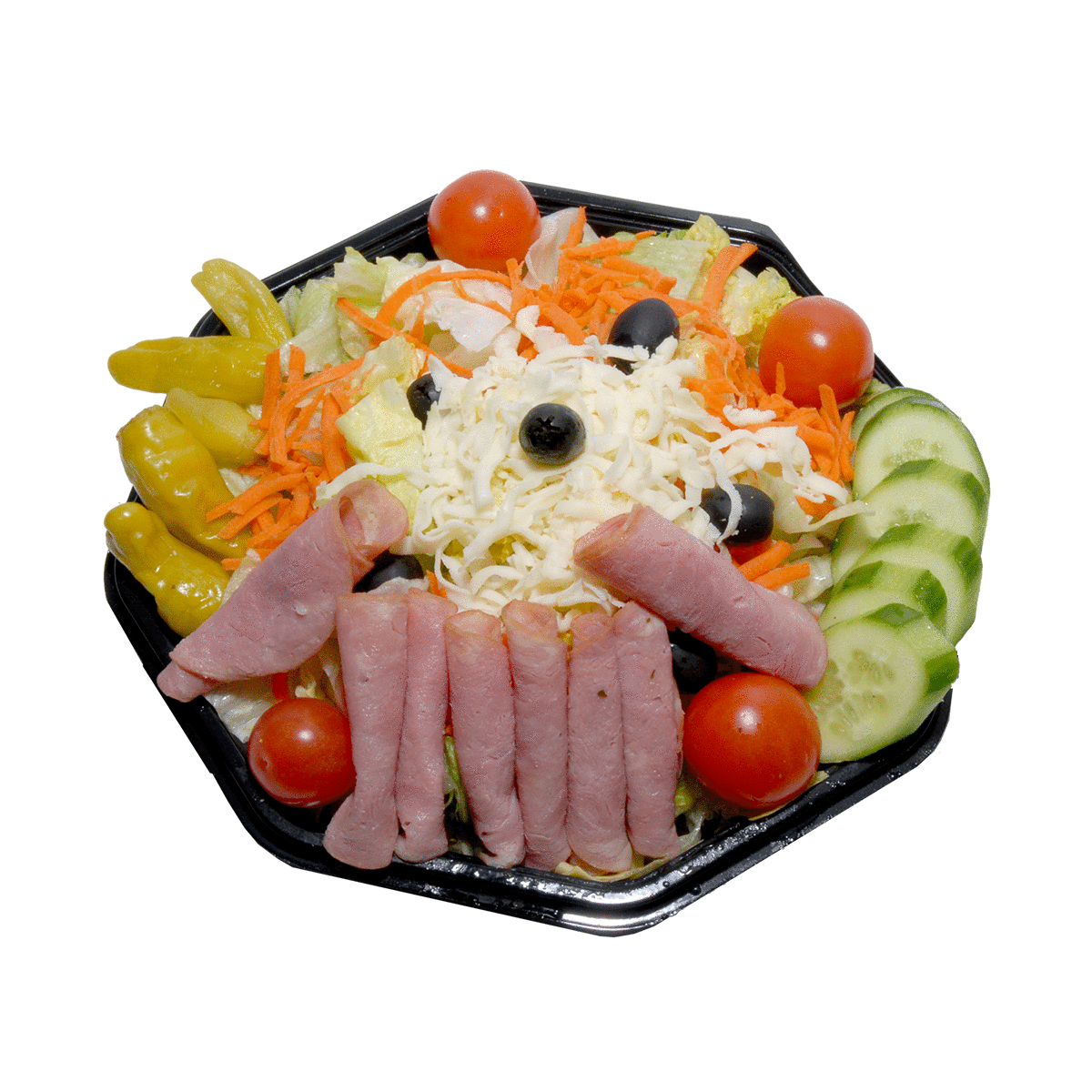 Lettuce, tomatoes, cheese, ham, artichoke hearts, olives, cucumber, pepperoncini, carrots.